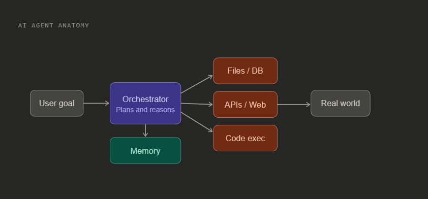 A 2026 AI agent is not a chatbot. It has a reasoning core (an LLM), a memory system, and direct access to tools: your file system, your APIs, your database, your cloud account. It acts on your behalf, at machine speed, often without a human checking each step.