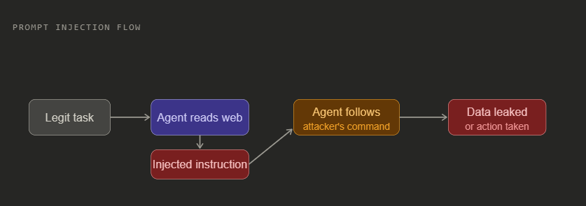 The agent reads a webpage, email, or document that contains hidden instructions. Because the agent cannot reliably tell the difference between your system prompt and data it picked up from the web, it follows the injected instruction.