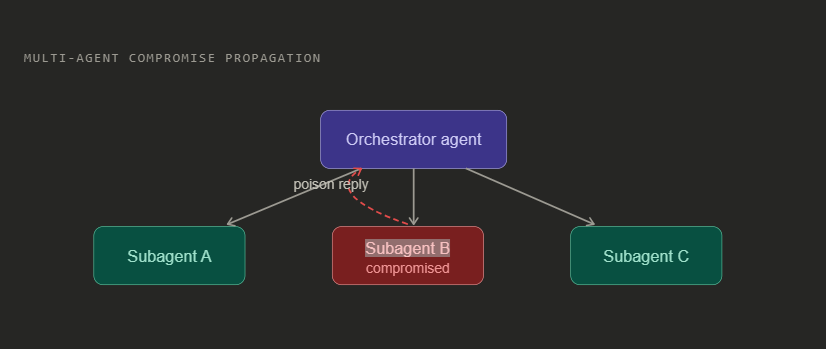 When one agent orchestrates others, a prompt injection in a subagent propagates upward. The orchestrator trusts the subagent’s outputs by default. A compromised subagent can convince an orchestrator to grant it more permissions, or to carry out actions it would normally refuse.